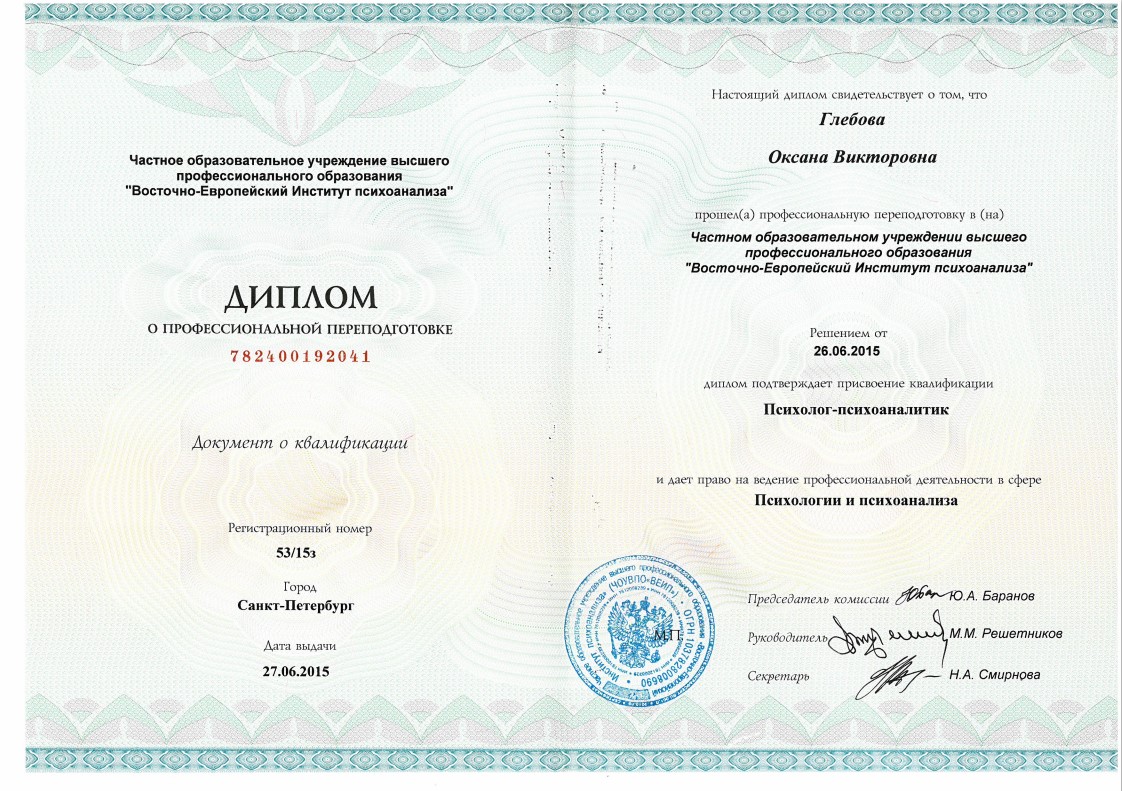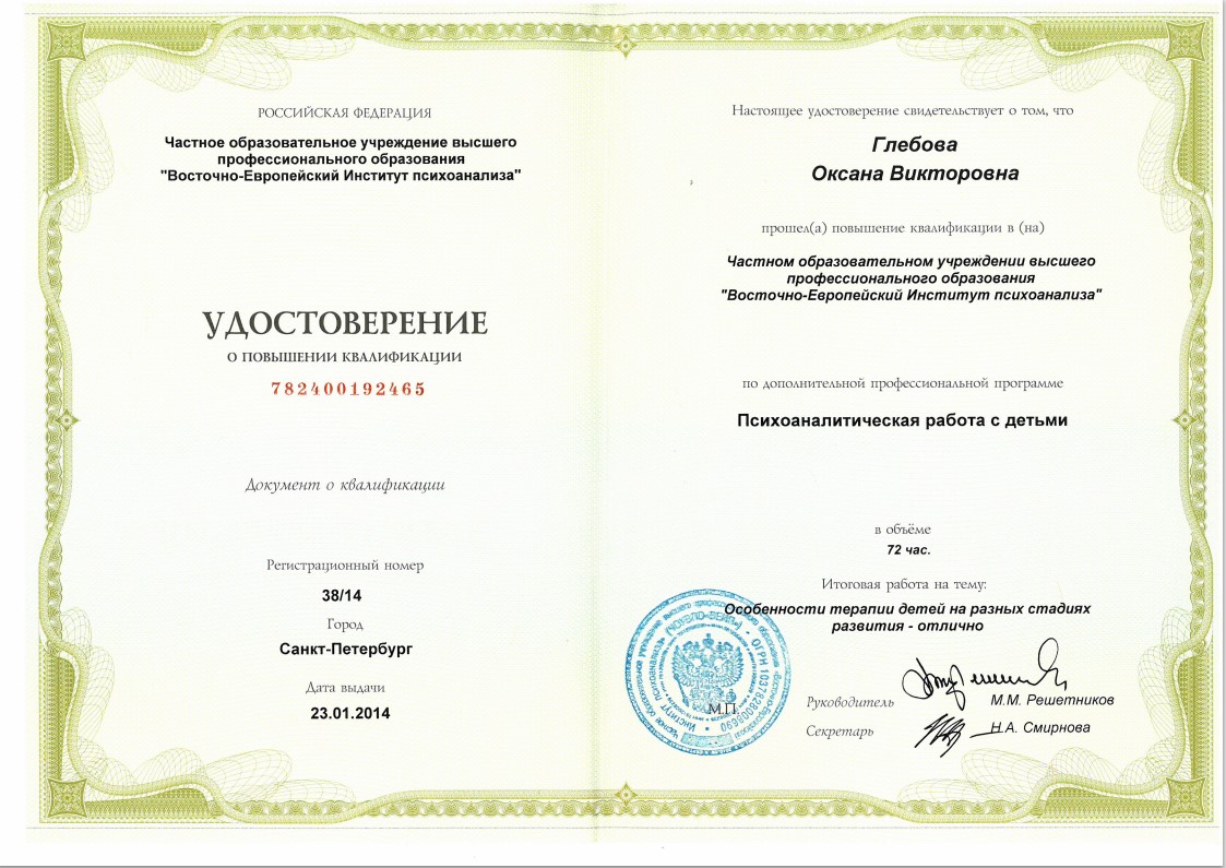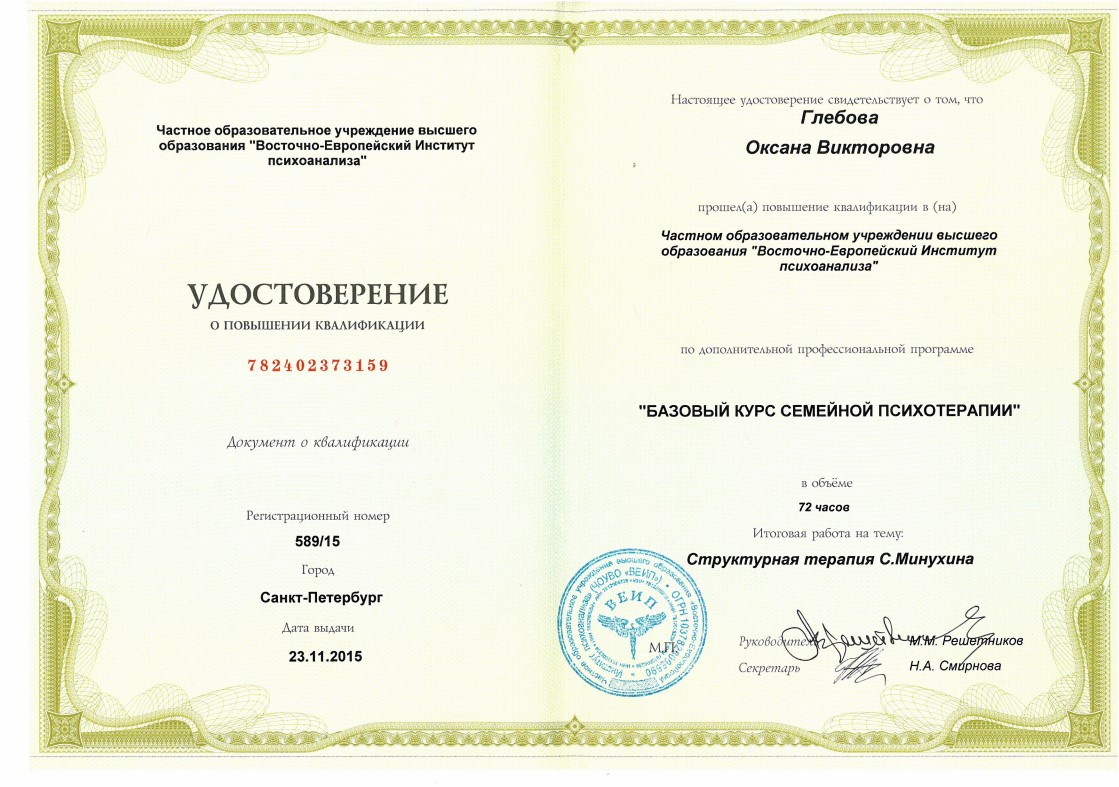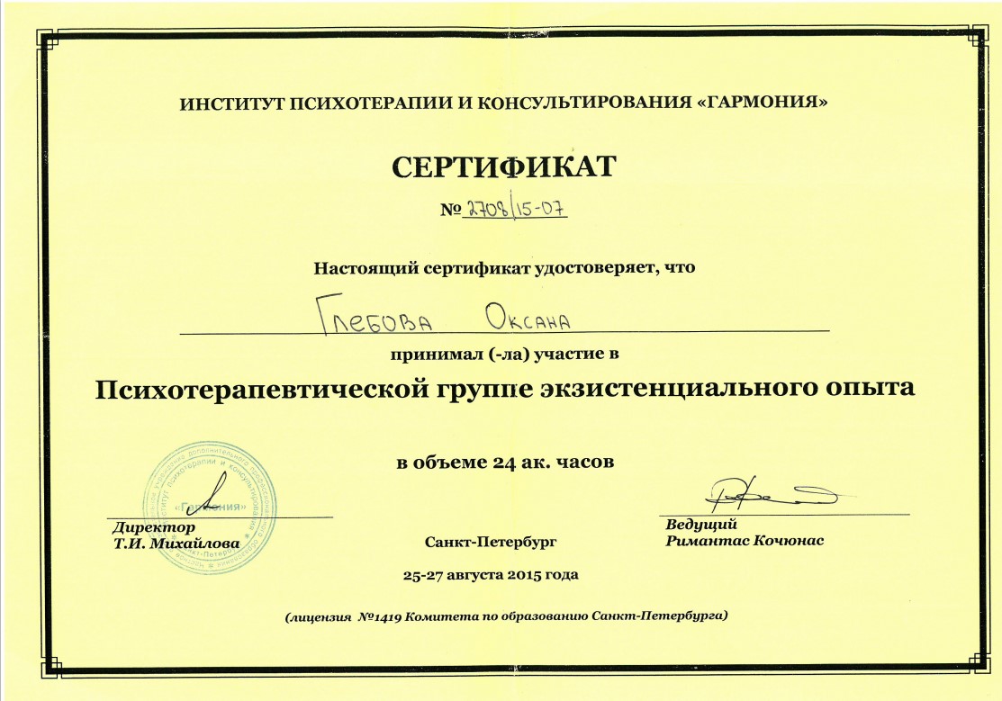 Слушатель 5-летнего курса по групповой психотерапии и групповым процессам израильского Института Группового Психоанализа (г. Хайфа, Израиль)