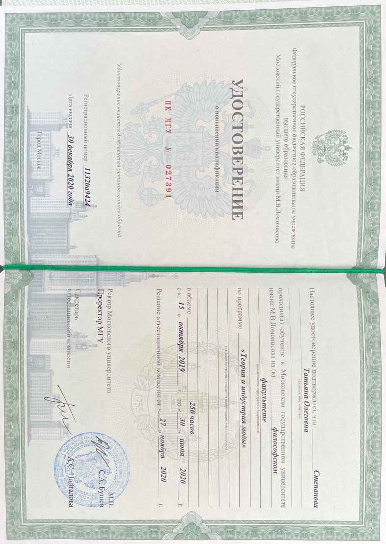 2019-2020 - МГУ им. М.В. Ломоносова, факультет философии, программа «Теория и индустрия моды», повышение квалификации